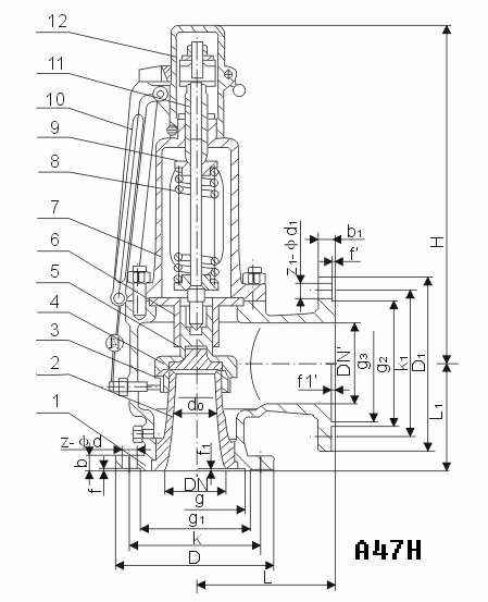 A47H带扳手弹簧微启式安全阀适用于工作温度≤350℃的蒸汽、空气等介质的设备或管路上,作为超压保护装置。
